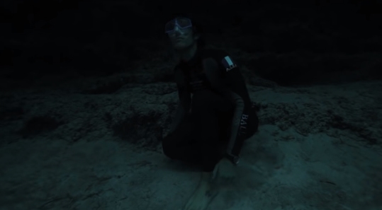 너무 깊어 깜깜한 물속을 어떠한 산소 장비 없이 묵묵히 들어가는 그의 모습이 인상깊다.