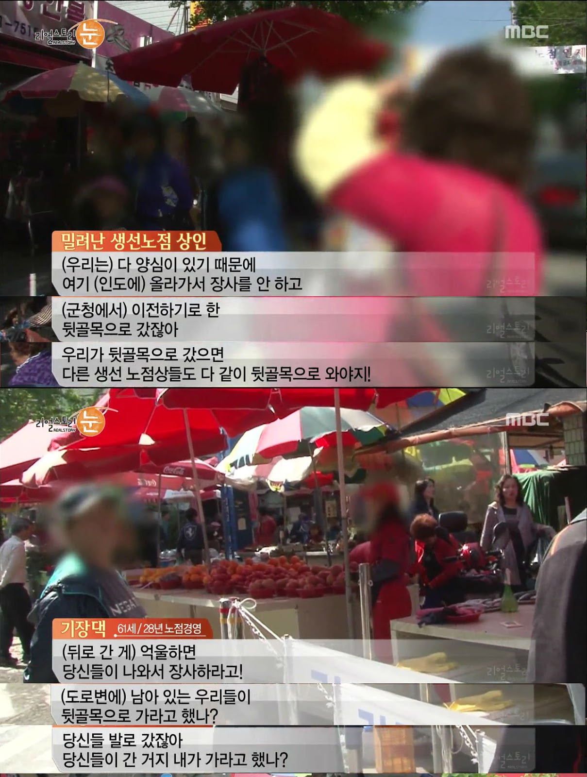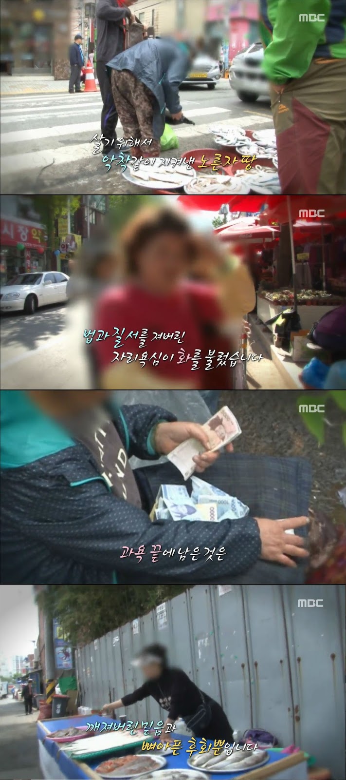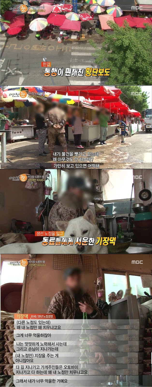 횡단보도 앞에서 장사하다가 교통사고가 날정도로 위험한 자리지만 당당하게 그곳에서 장사를 계속하는 아지매
